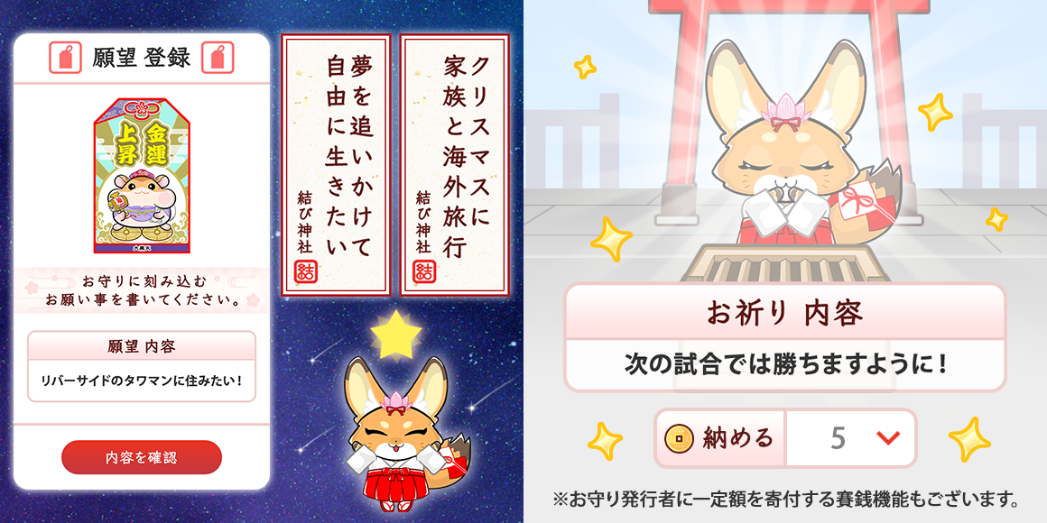 共通の願いを持った仲間と励ましあったり、誰かの願いを応援したり、お守りをプレゼントしたり、結・MUSUBIはお守りNFTで人と人を結びつけるコミュニティサービスです。